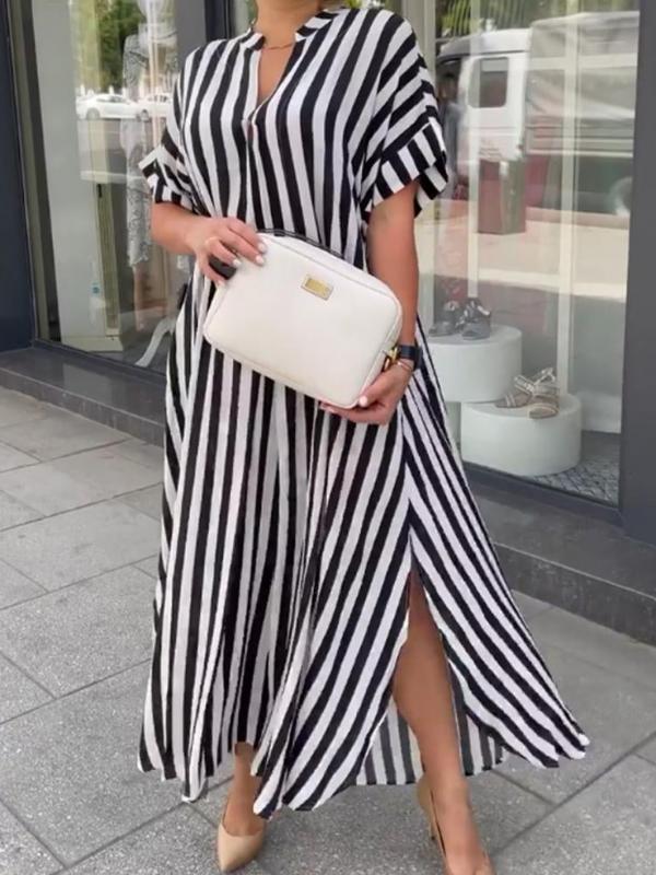 The classic shirt collar and striking vertical stripes elongate your silhouette, while the breezy fit and leg split add movement and a touch of allure. It’s your go-to for looking polished and feeling at ease.