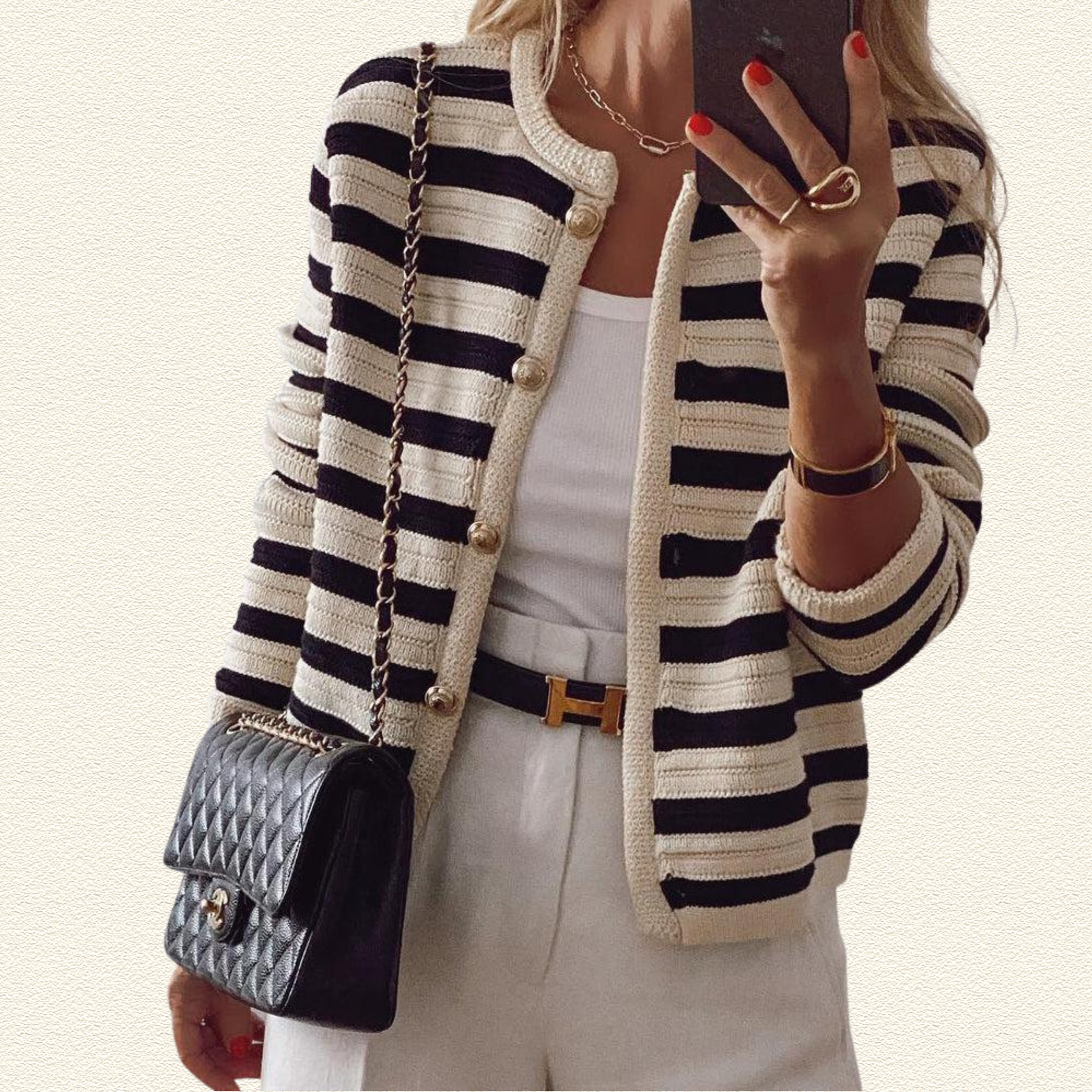 Our Stella striped cardigan is an oasis of comfort and luxury, with an ultra-soft texture that envelops you in blissful softness throughout the day. It feels like a warm embrace, making you feel at ease wherever you go. Perfect to wear during autumn days when the weather can still fluctuate a little. You will shine and feel good about yourself in this gorgeous cardigan!